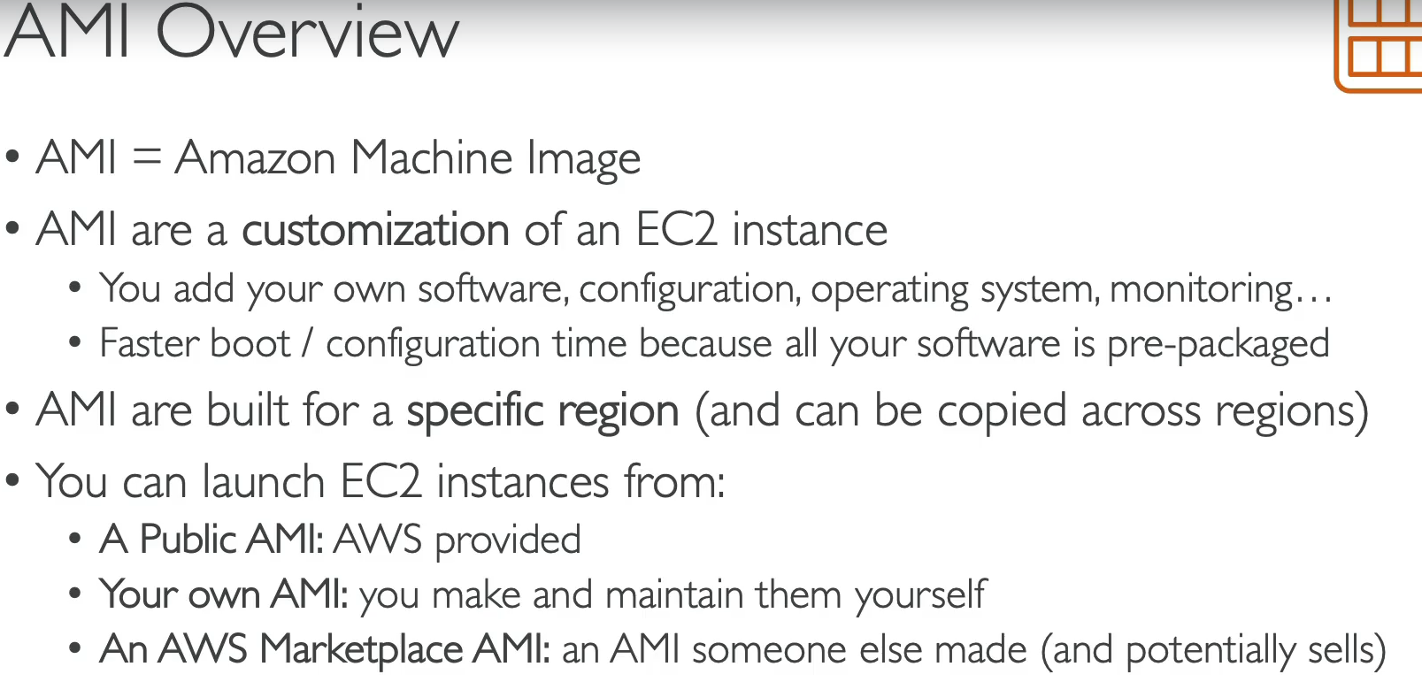 - AWS-provided → Standard OS images (Amazon Linux, Ubuntu, Windows).