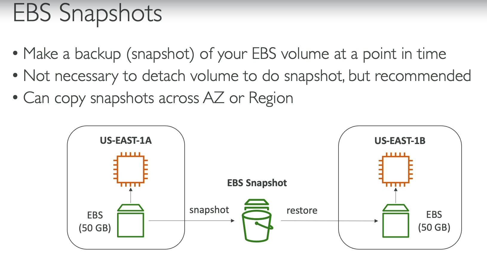 - Attach/Detach → Volumes can be attached/detached from EC2s in the same AZ.
