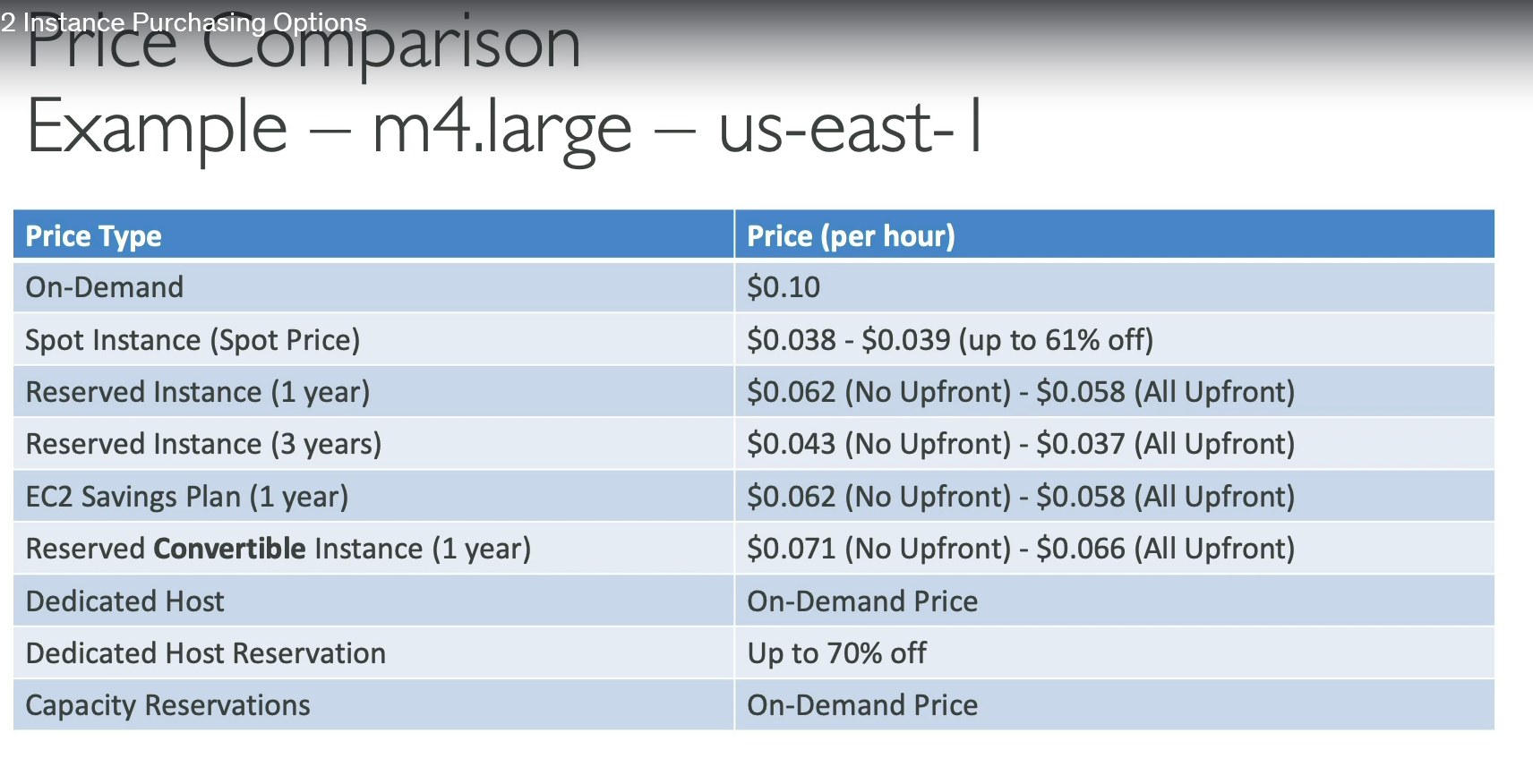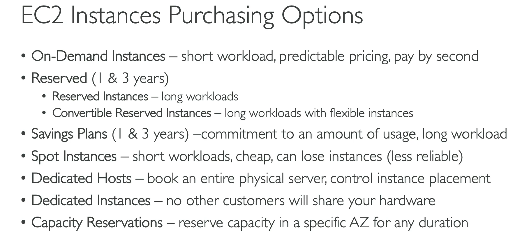 - Spot β Bid on unused capacity, very cheap, can be interrupted.