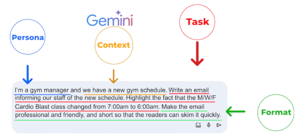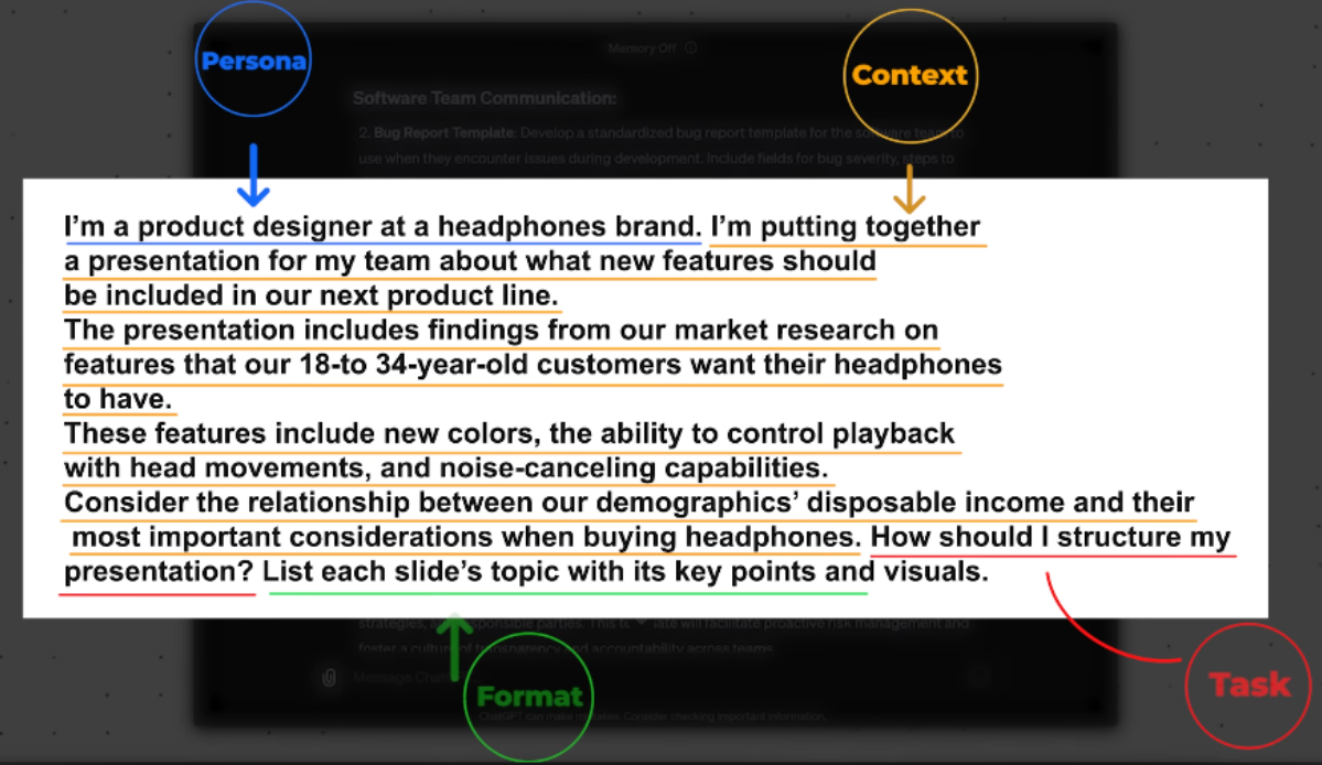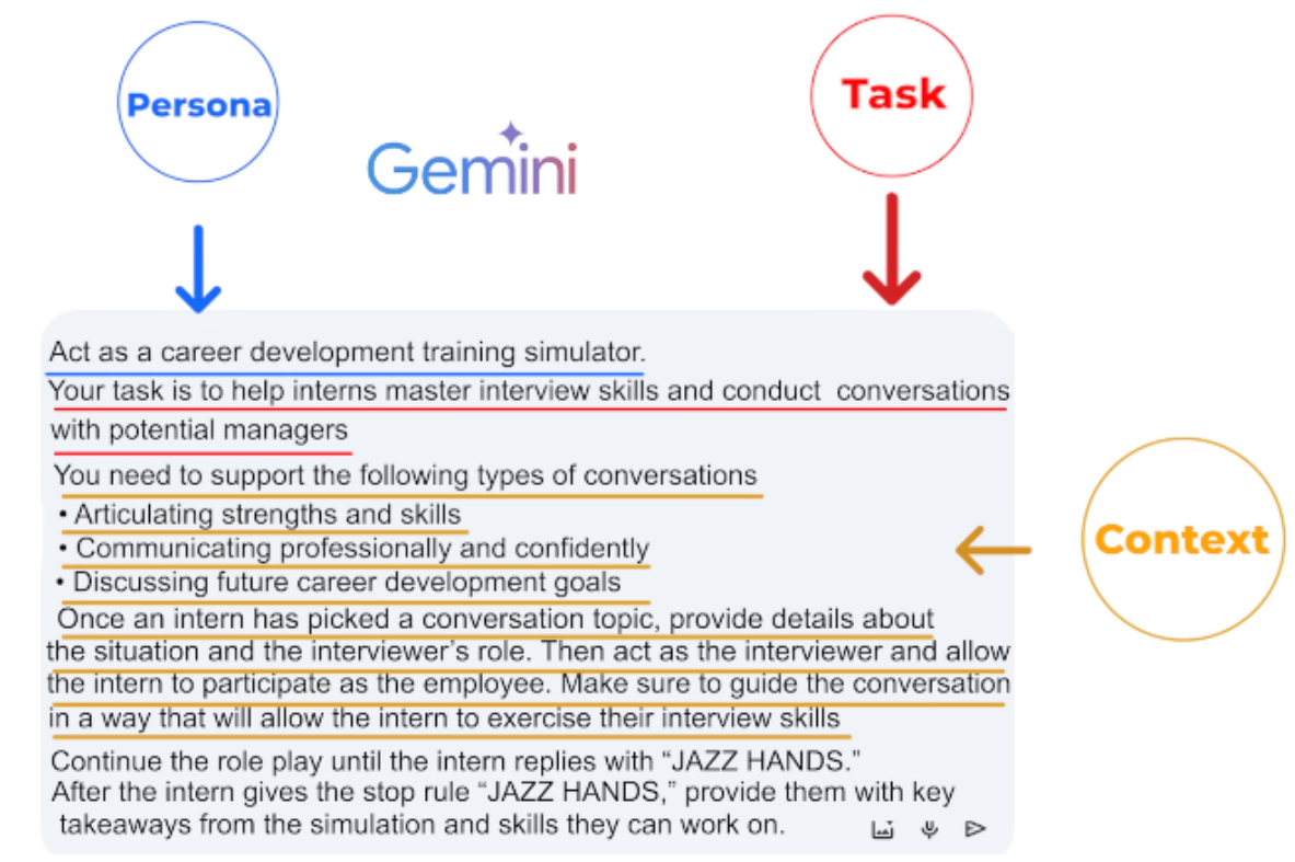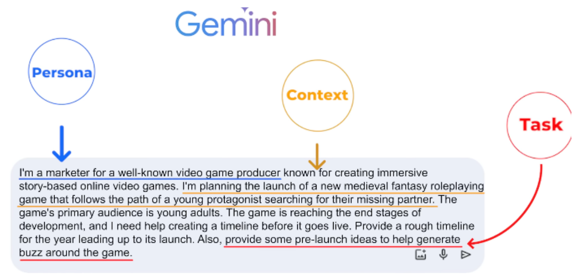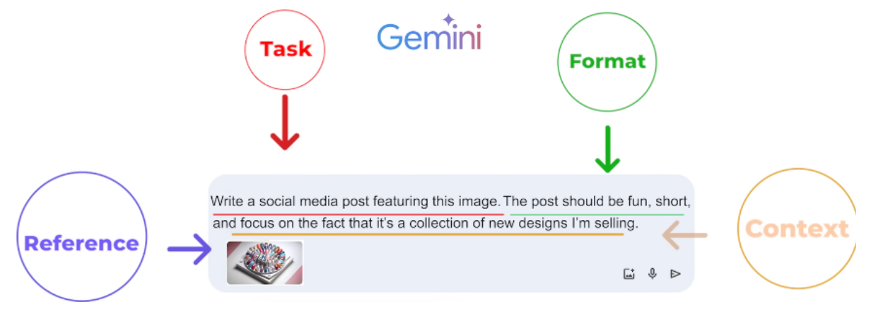 1)​ Task : what you want the AI to do (Persona, Format of the output) 2)​ Context : Elaborate stuff 3)​ References: Examples , 4)​ Evaluate: output (format we want) 5)​ Iterate: Circular process (refining the prompt until we get great output)​