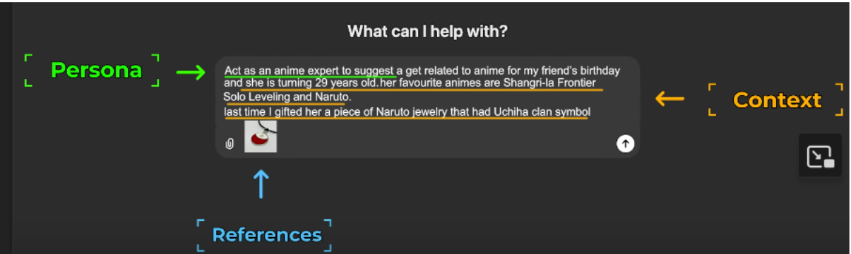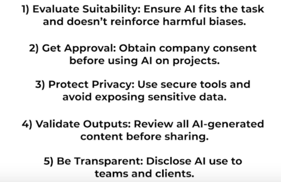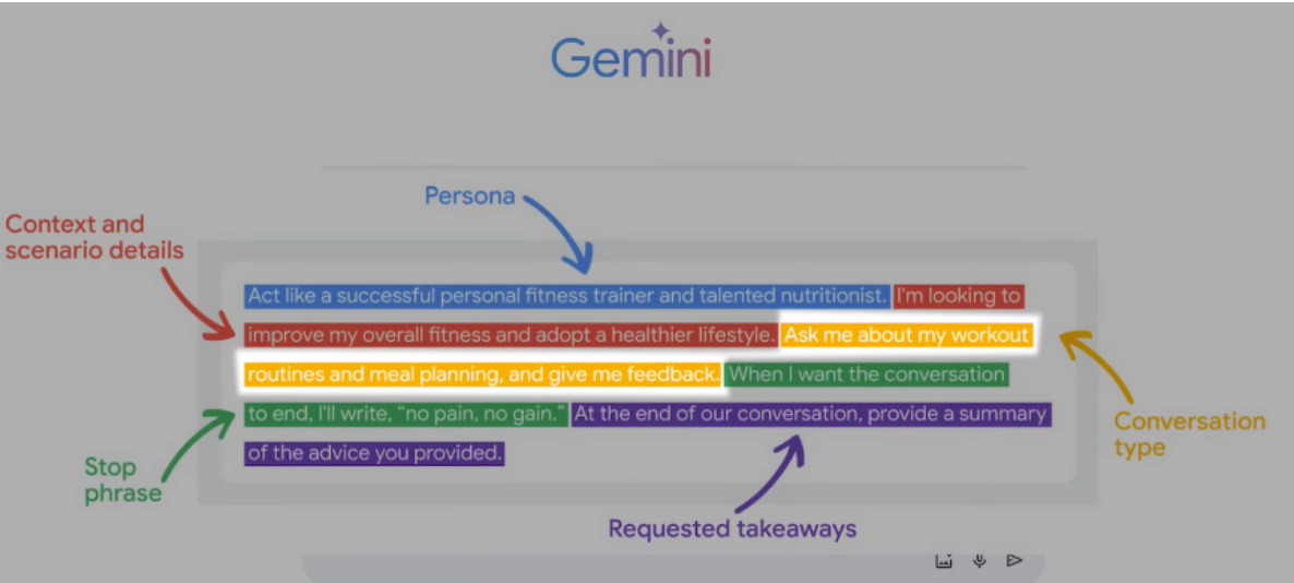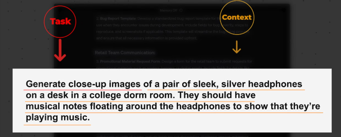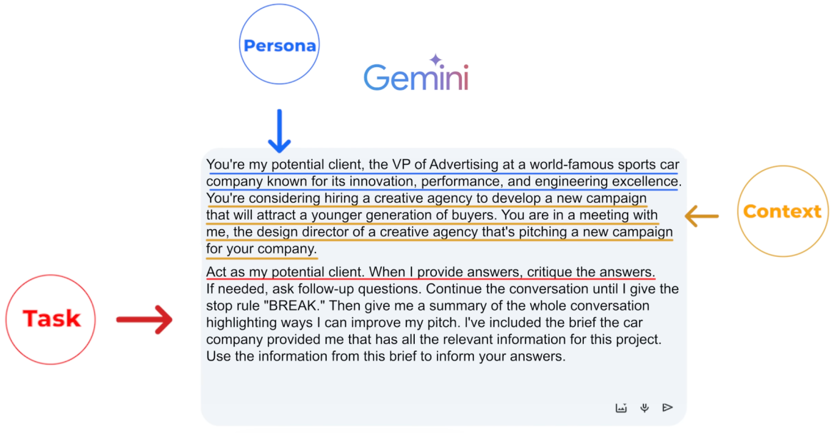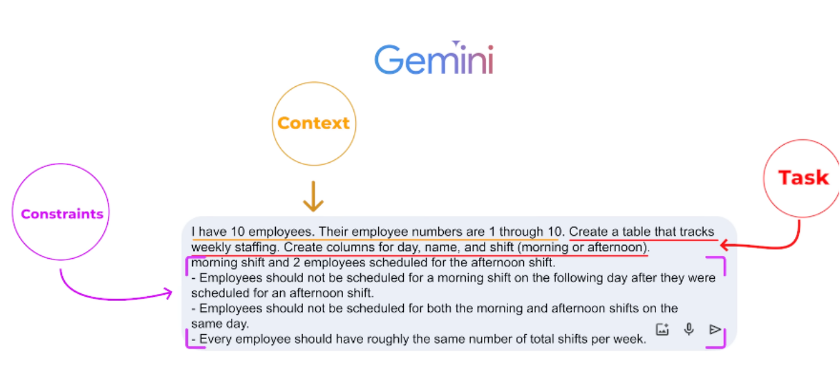 1)​ Task : what you want the AI to do (Persona, Format of the output) 2)​ Context : Elaborate stuff 3)​ References: Examples , 4)​ Evaluate: output (format we want) 5)​ Iterate: Circular process (refining the prompt until we get great output)​